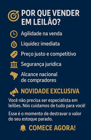 Agora também oferecemos um serviço completo para empresas que desejam vender seus produtos, veículos, imóveis ou estoques parados por meio de leilões oficiais e registrados. Cuidamos de todo o processo de precificação, regularização e divulgação, garantindo liquidez, agilidade e alcance nacional.